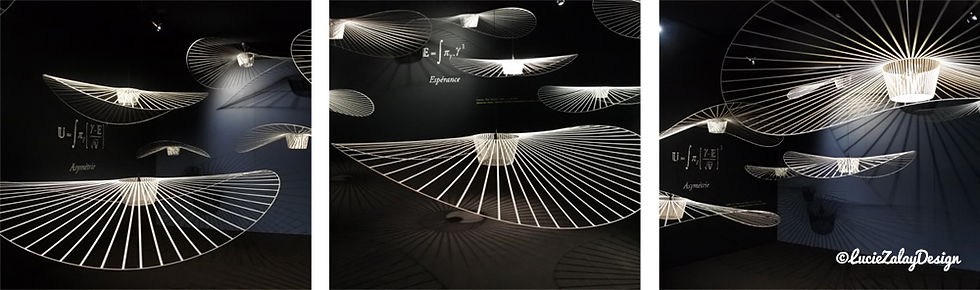 La deuxième partie de l’exposition dévoile la vie des objets. Des objets imaginés, façonnés, par Constance Guisset. La première salle, la plus époustouflante selon moi, présente la lampe Vertigo, ou plutôt l’objet Vertigo, dans toute sa poésie et sa beauté. En effet, pour qu’on se concentre sur l’objet en tant que tel, les ampoules ont été retirées, laissant de côté la fonctionnalité des Vertigo. La scénographie, tout en légèreté nous envoûte. Ce sentiment est renforcé par la musique (Studio MBC), et les équations inscrites sur les murs (Laurent Derobert) signifiant l’espérance, l’inconstance, l’asymétrie ou les abysses …